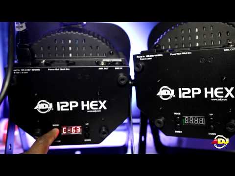 12P HEX professional features include: 4 DMX modes (6, 7, 8, & 12 channel), 5 operational modes, 5 dimming curves, flicker free operation and a 4-Button DMX menu with digital display. Daisy-chain up to 6 units (110V) or 13 units (240V) together via the fixtures built-in IEC In/Out power connectors.