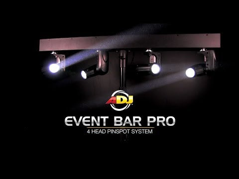 The ADJ Event Bar Pro helps you create pure lighting excitement with powerful, sharp white beams of light. Powered by four 10-Watt white LEDs, this 4-head Pinspot system produces small 5-degree beams from exciting built-in programs. Users may also individually program each head's movements with a DMX controller (sold separately). The Event Bar Pro is a versatile fixture that may be used to spot tables, décor and retail environments, or used as a special effect light at night clubs or other parties. The Event Bar Pro’s base has built-in DMX In/Out, IEC power In/Out connectors, a 4-Button DMX digital display, built-in microphone for sound activation and ¼-inch input for ADJ easy-to-use UC3 controller (sold separately). There is also built-in mount to hang the Event Bar Pro on a tripod stand (stand sold separately).