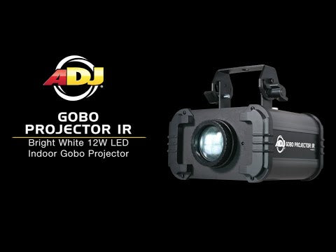The ADJ Gobo Projector IR is a white 12W LED projector that comes with 4 GOBO patterns and 4 color gels. Custom GOBOs may be inserted for monogramming events or company logos for corporate functions. There is a FX switch on the rear panel to control rotation or static movement. The Gobo Projector IR is compatible with the ADJ UC IR wireless remote (sold separately).