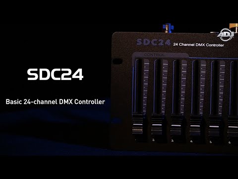 The ADJ Lighting SDC24 is a basic 24-channel DMX Controller that operates via an external 12VDC power supply (included) or a 9VDC battery (not included). SDC24 has 5-pin and 3-pin DMX output sockets, DIP switches to set a starting DMX channel, a master dimmer fader, an on/off switch and Channel Page button with Indicator LEDs.